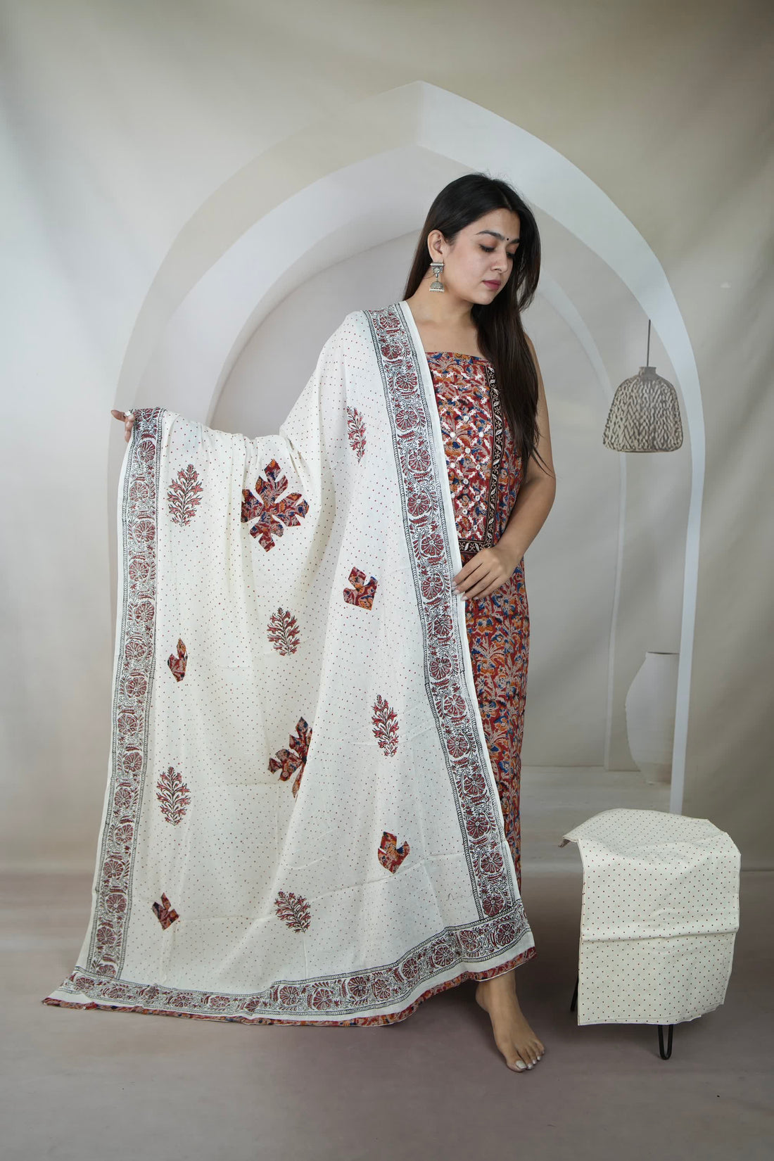 Applique Work Kalamkari Cotton Suit Material Intricate Applique Work: Features stunning applique work, with fabric...