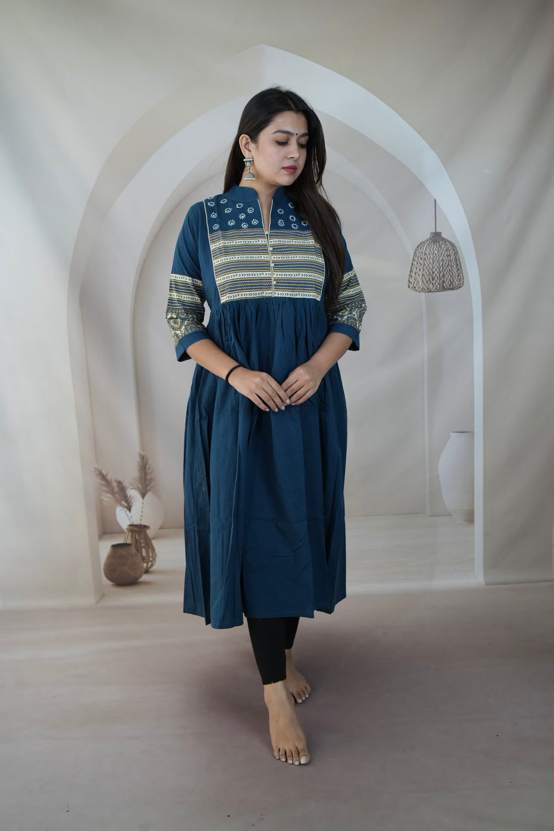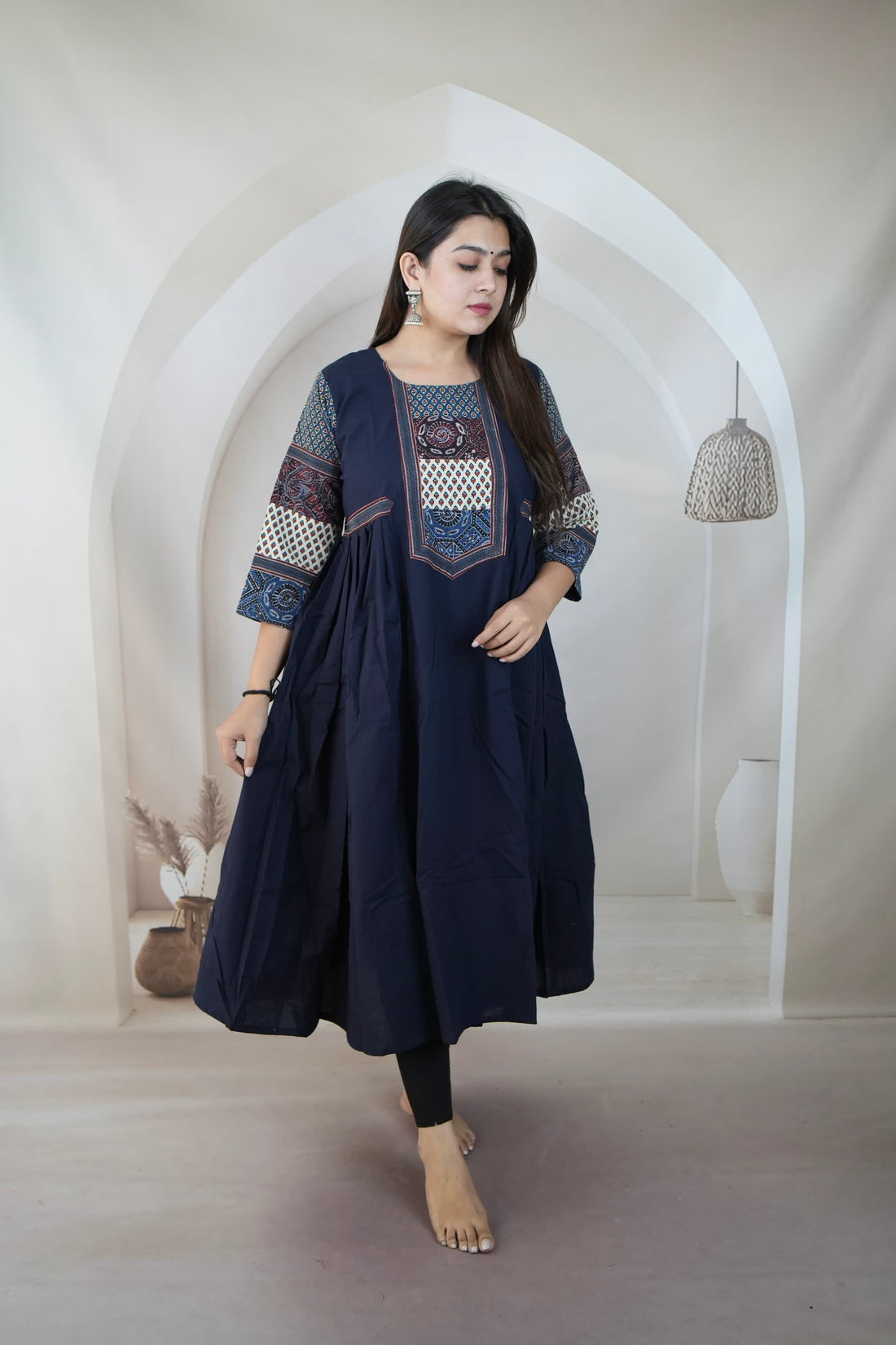 Gauri Navy Blue Ajarakh Patchwork Mirror Cotton Plain One Piece Kurti