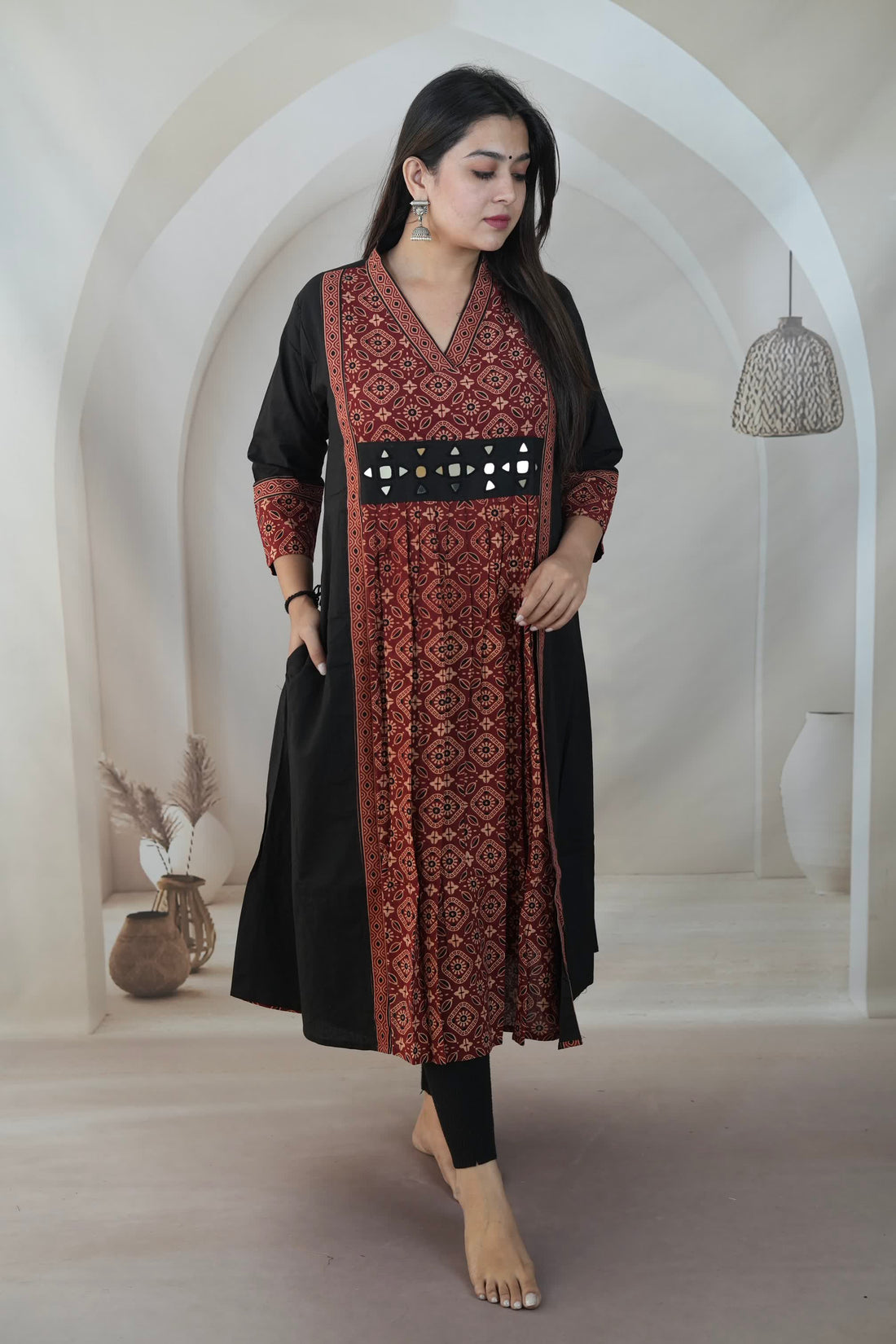 Avantika Black Cotton Collar Mirror Ajarakh Kurti RAKHIYO