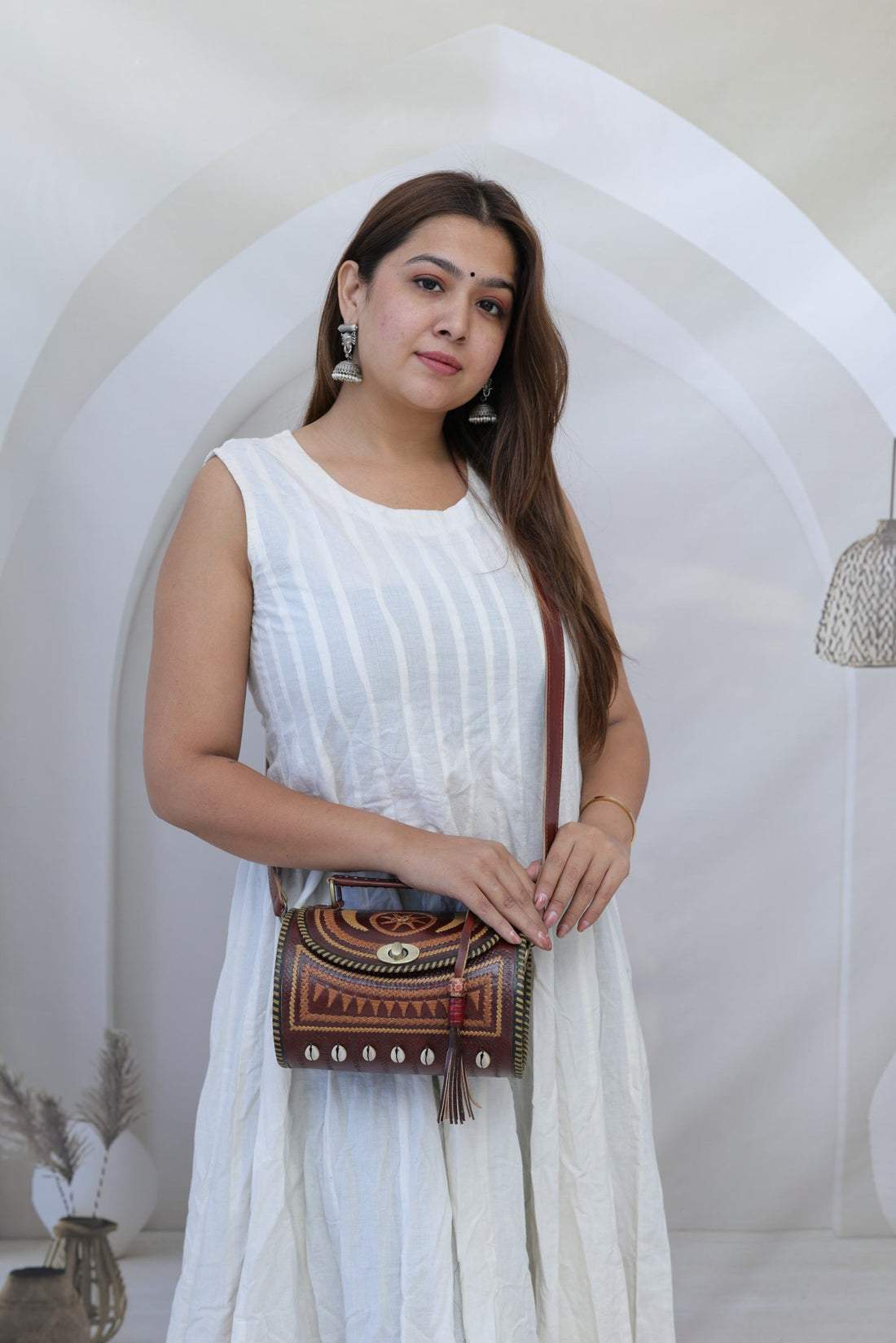 Kodi Brown Embroidered Dholak - The Leather Sling Bag