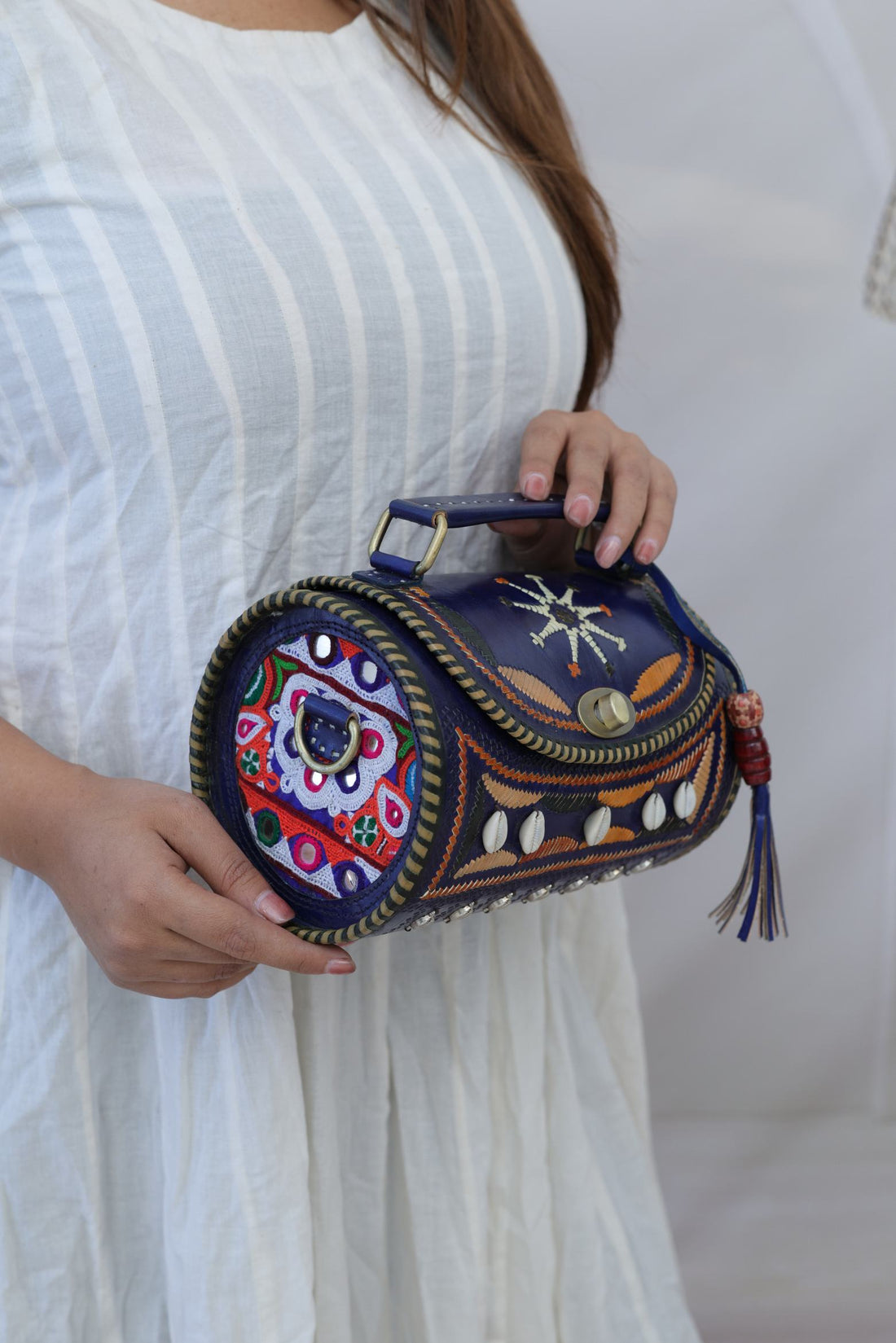 Kodi Blue Embroidered Dholak - The Leather Sling Bag
