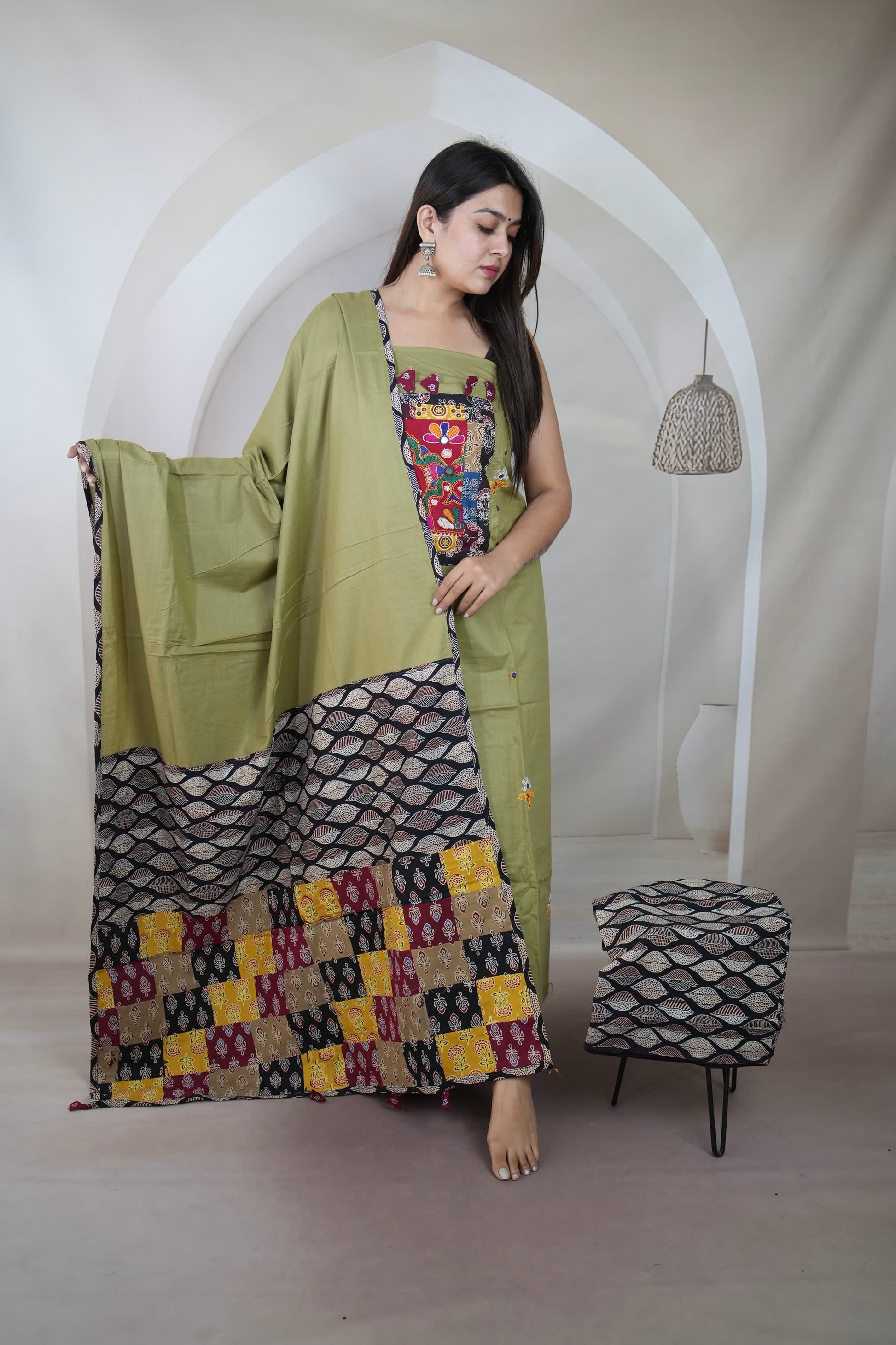 Beige Ajarakh Antique Patchwork Cotton Suit Material