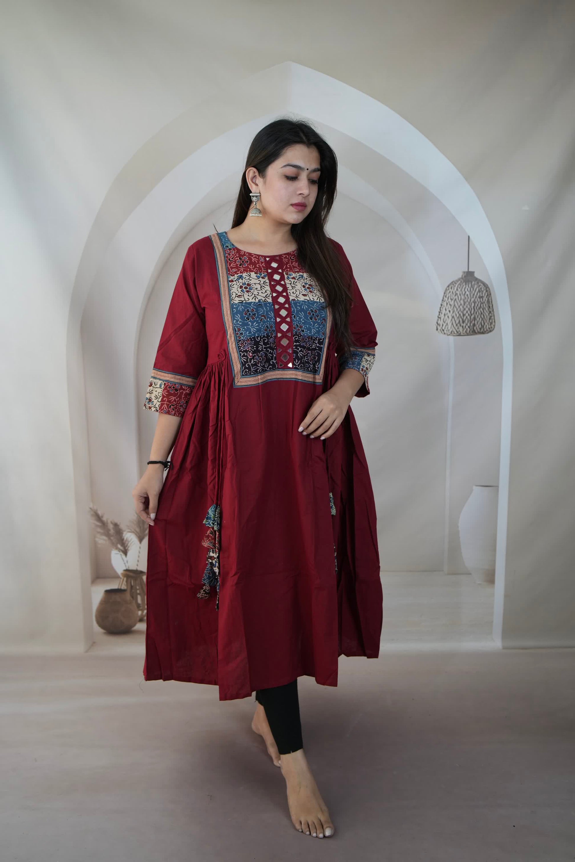 Gauri Maroon Ajarakh Patchwork Mirror Cotton Plain One Piece Kurti