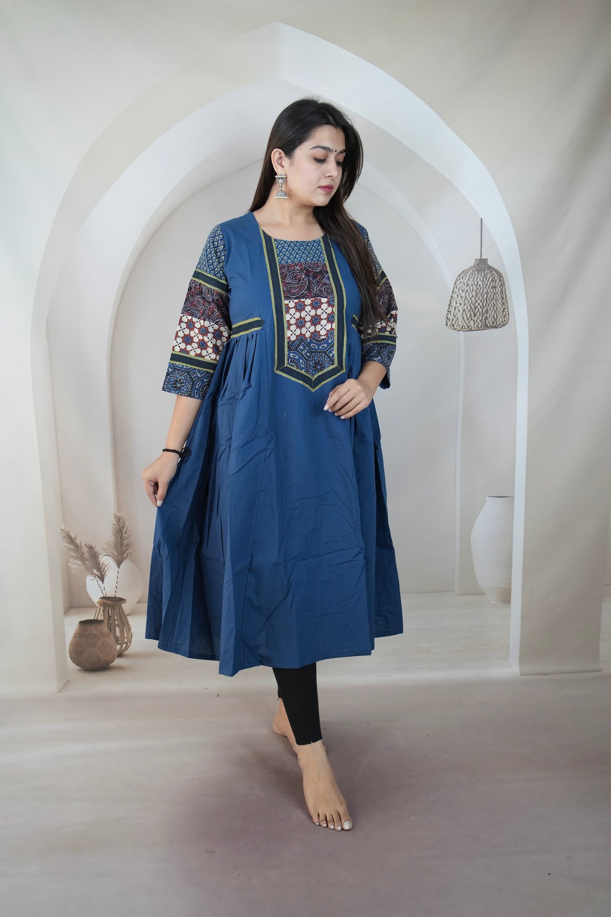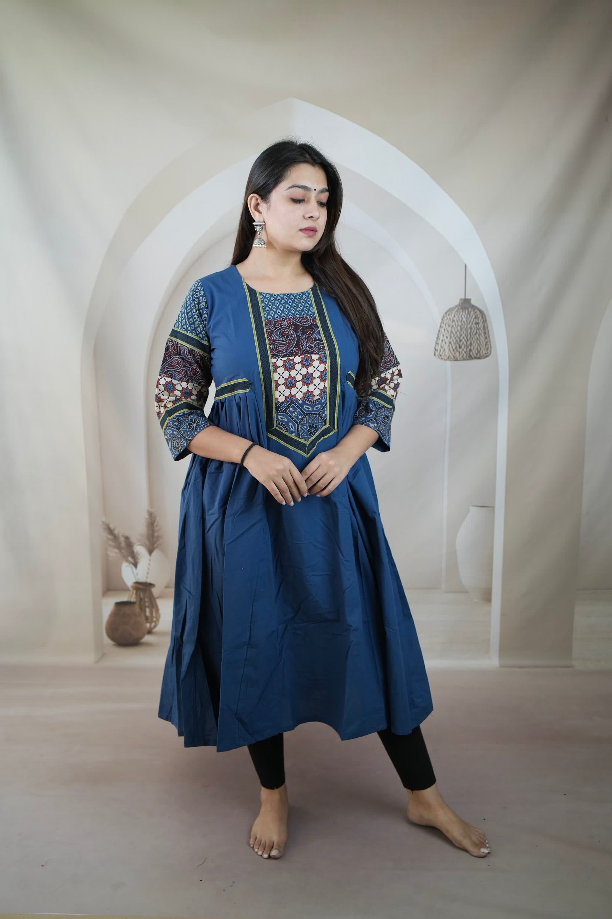 Indigo Kriya Ajarakh Patchwork Sleeve & Neck Side Split Kurti
