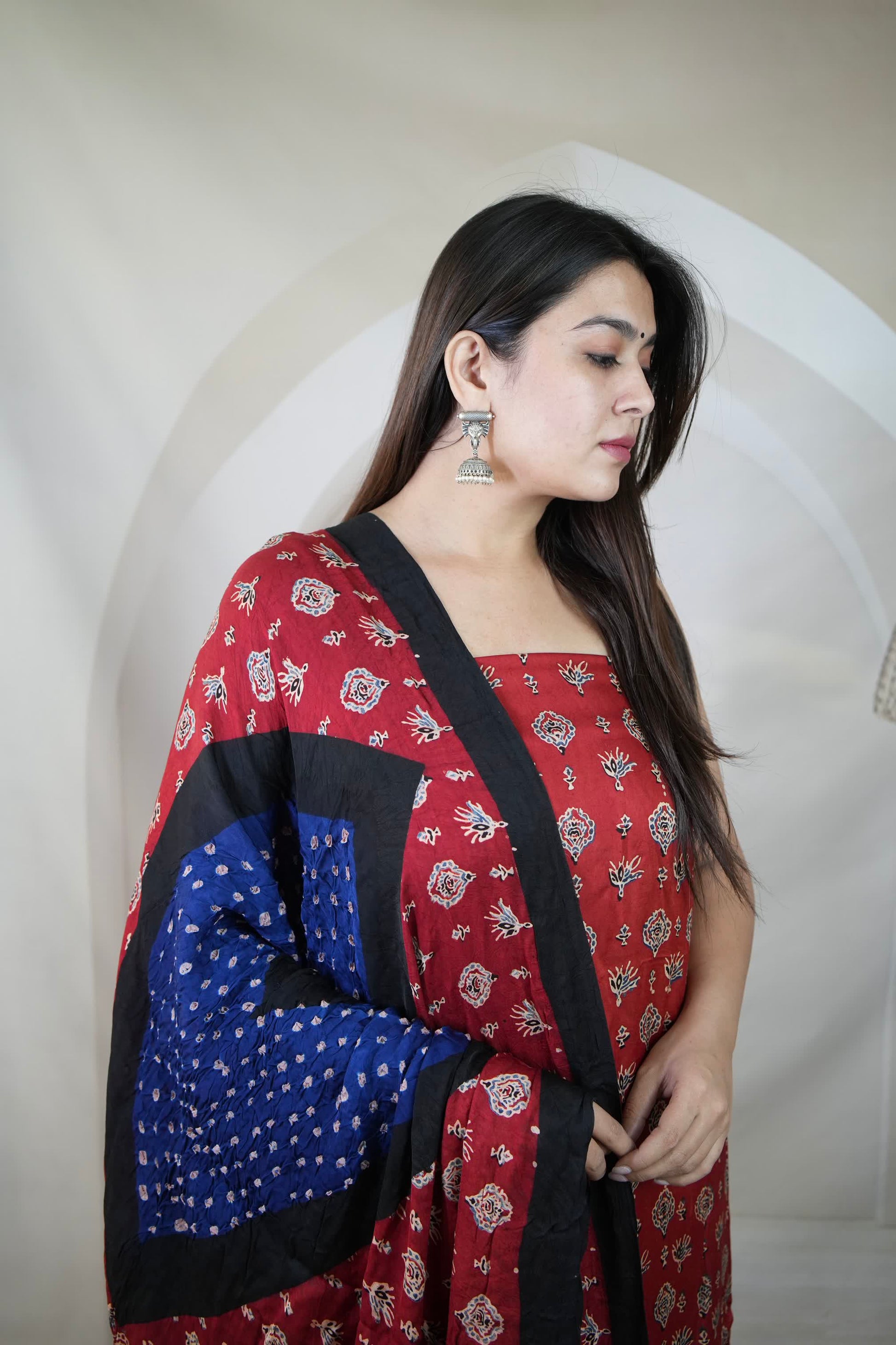 Dupatta: Ajarakh Bandhani with elegant tissue palla for a festive finish