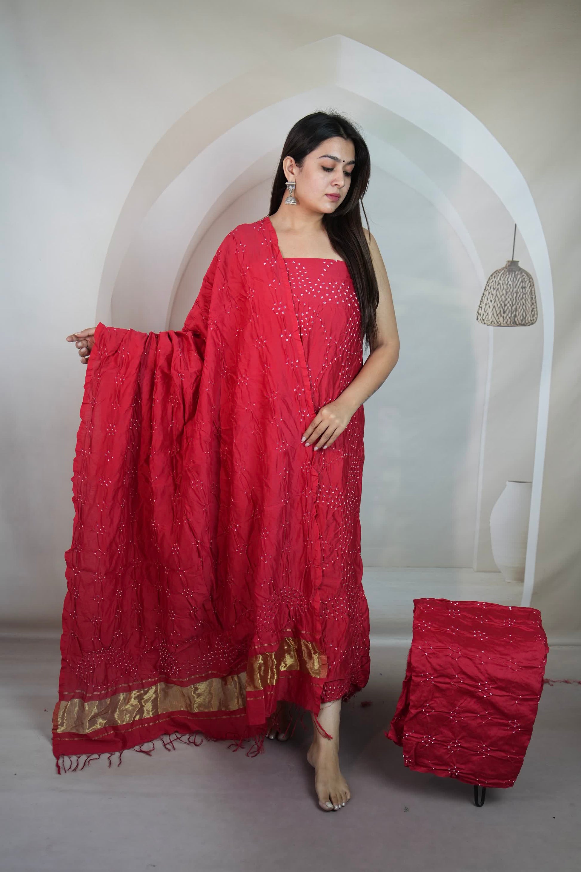 Red Rai Bandhej Chanderi Silk Premium Suit Material